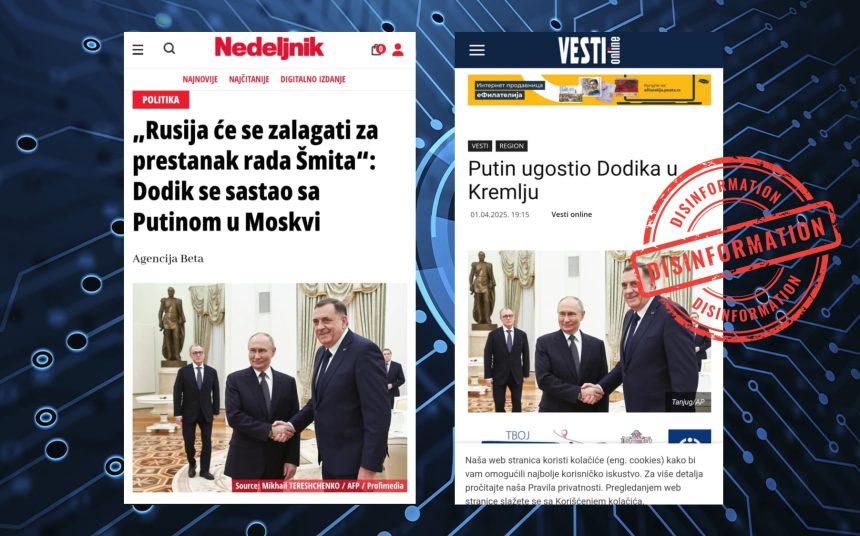 Portali Politika dhe media të tjera serbe raportojnë për deklaratat e Milorad Dodik pas takimit të tij me Vladimir Putin, në të cilat ai përhap një sërë dezinformatash për rolin e Rusisë në Bosnje dhe Hercegovinë.